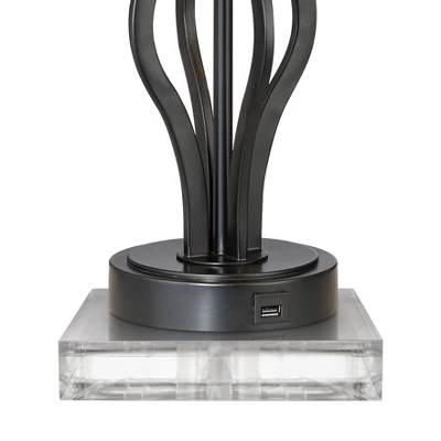 This set of two iron table lamps add understated style to your living space. From the designers at 360 Lighting, this pair of lamps is accented with a USB port in the base of each, offering an easy spot to charge a smart phone or tablet. Each lamp boasts a dark finish with a trimmed drum shade. Each lamp has a 8″ square riser.