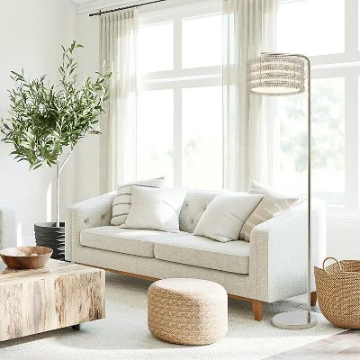 Add a glam lighting option to your bedroom, living room or foyer with this 61.5″ H Quigley Silver Drum Shade Floor Lamp from River of Goods. This floor lamp showcases a chrome-finish silver metal candlestick base and a white fabric drum shade with silver metal charms for a standout look with a touch of shine. The lamp requires one 60-watt E26 bulb (not included) to cast a soft, warm glow, and the 90-inch cord with a foot switch allows for versatile placement in any room.