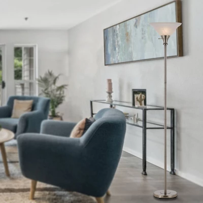 Cal Lighting makes this Contemporary tall metal torchiere in Brushed Steel finish with frosted glass shade. The 150W 3 way switch gives you light level options. (Bulb is not included.) One or two of these great looking torchiere floor lamps will be a great addition to your living room, family room, bedroom, or office.