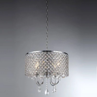 Bring a bit of glam to your dining room with this deluxe chandelier. The crystal-studded shade and drop-crystal accents shimmer in the glow from four bulbs, giving your space a romantic, sparkling quality. With its round chrome frame and curved arms, this fixture fits into a contemporary room.