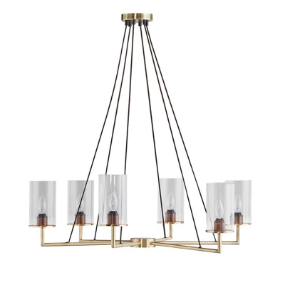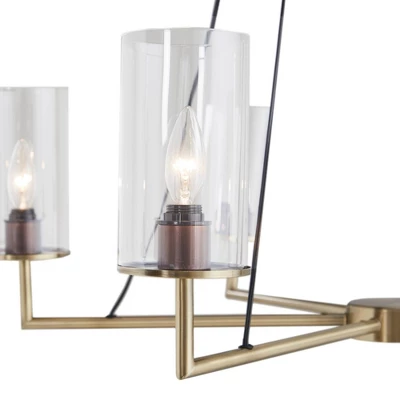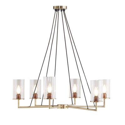 The Trenton 6-Light Chandelier with Cylinder Glass Shades by INK+IVY brings a simple, yet bold update to your home decor. This minimalist-inspired chandelier features 6 angular supports in an antique brass finish with upright lighting and glass cylinder shades, for a modern look. The antique brass ceiling mount complements the contemporary design, while the connecting cords emphasize the contemporary design making it a chic addition to your dining or kitchen space. Uses 6, E12, CFL 13W or LED 9W Type B light bulbs (not included)